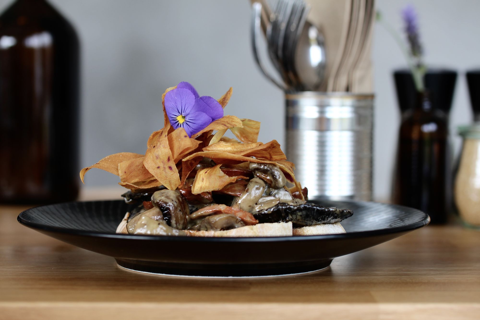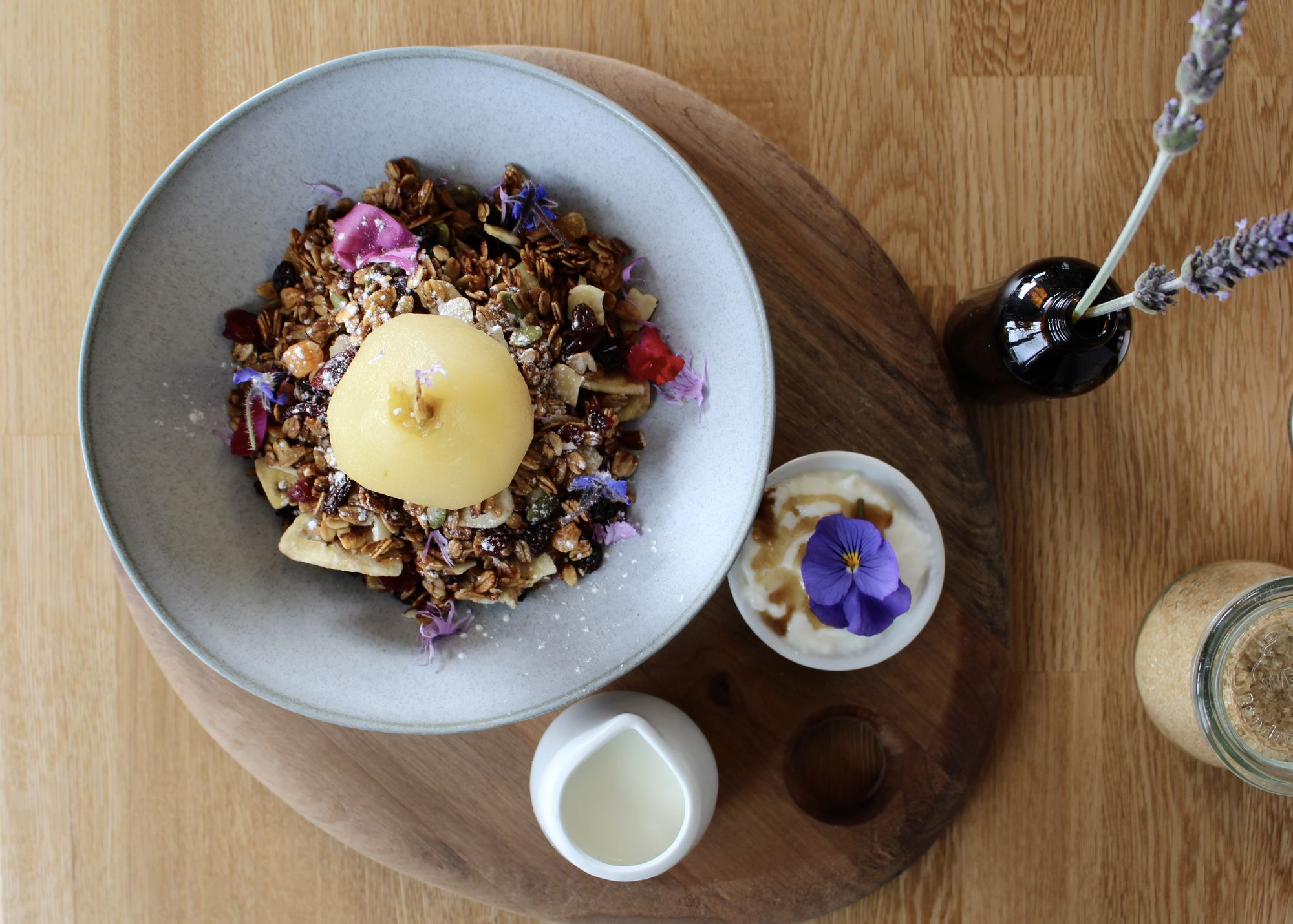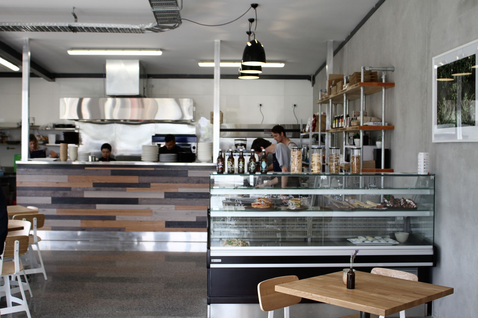 Clean exterior lines are complimented by a contemporary Café fit-out. Industrial finishes in dark tones and expressed services installations make for an interesting canvas to deliver colorful creative dishes that come alive in this raw space.
