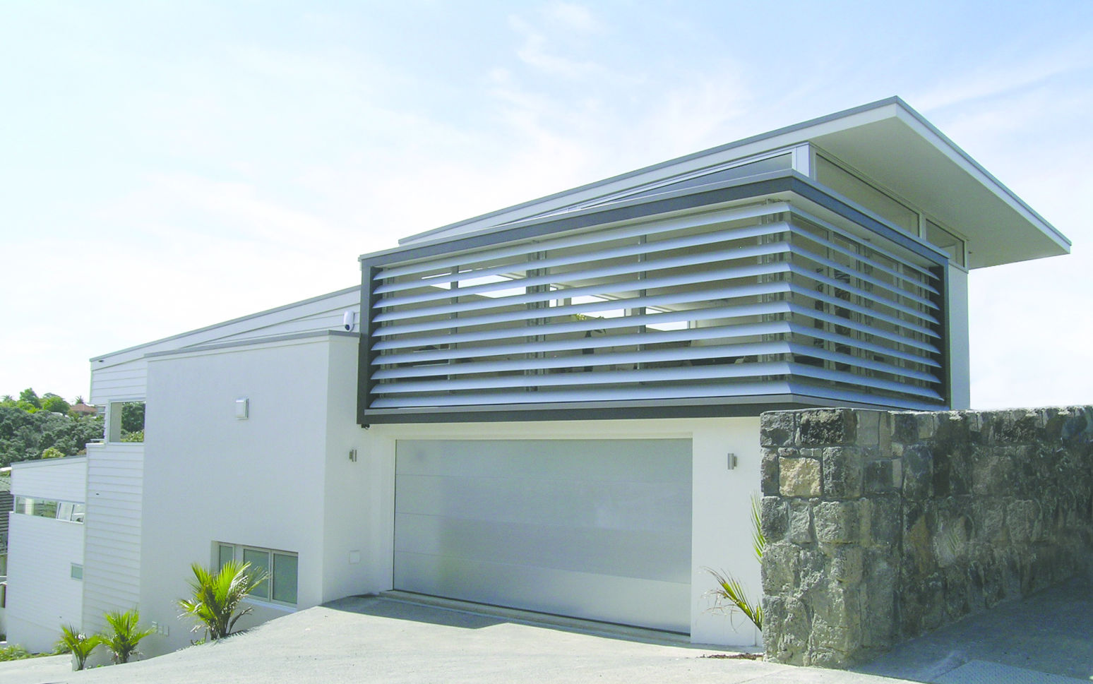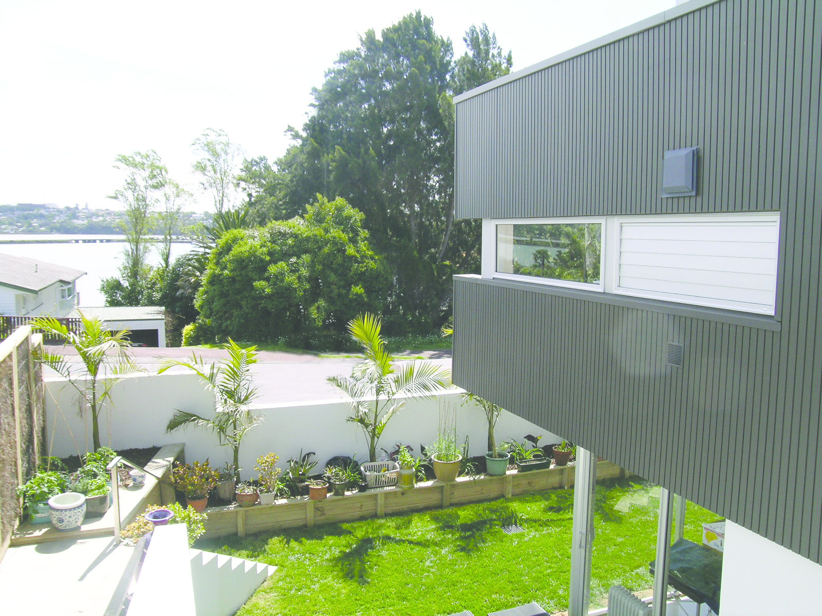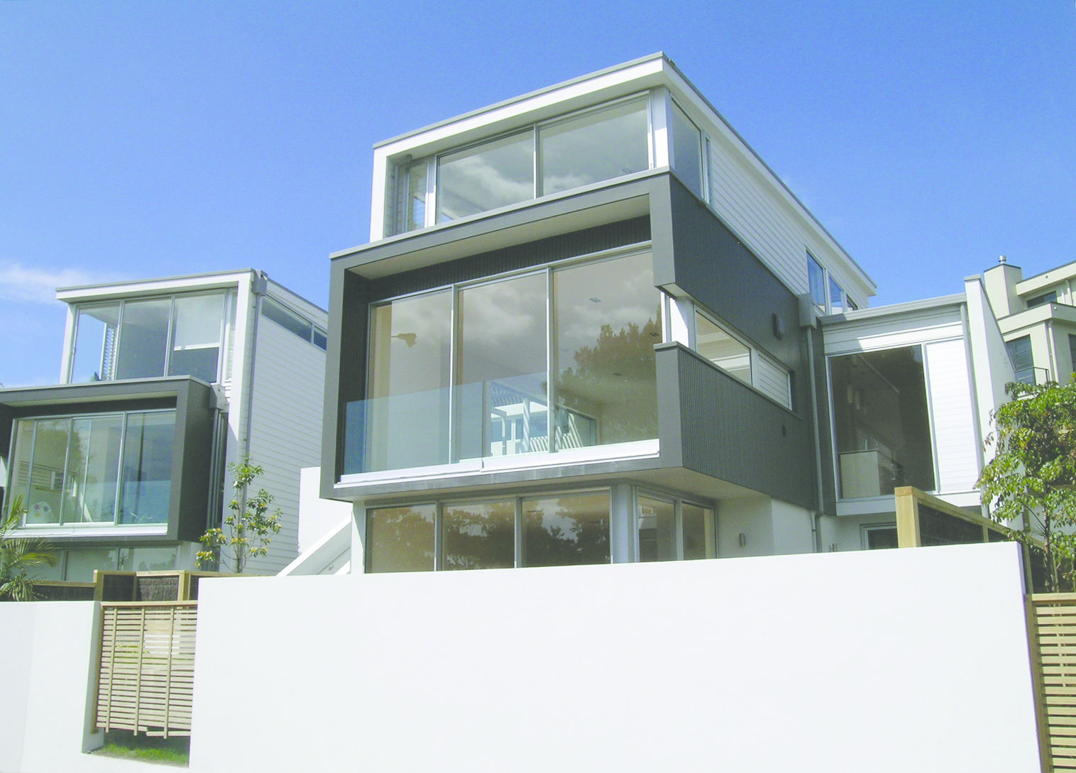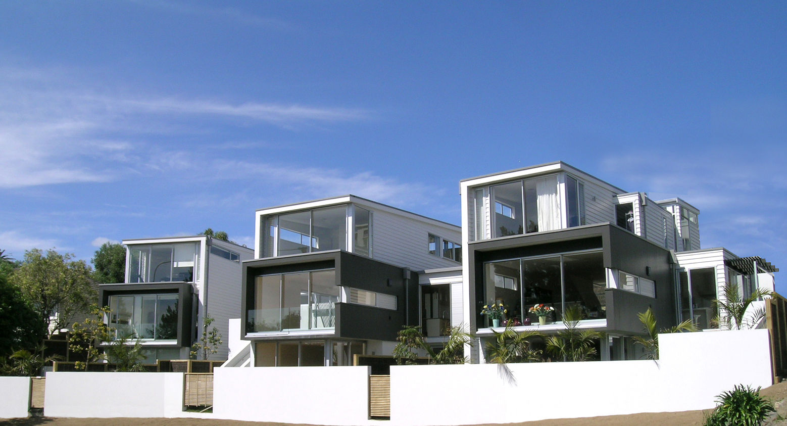 The sloping site with views over Orakei Basin to the city provided the opportunity to develop five free-standing houses on compact sites.