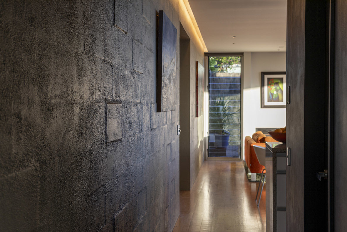 Textured breezeblock blockwork provides tactile interest and runs spine-like from the interior to the exterior; Connecting the living spaces and creating visual continuity, it is both striking and functional. Breezeblocks combined with the concrete underfloor function as a heat sink, holding warmth in winter and staying cool in summer. Louvres strategically positioned for cross-ventilation amplify natural airflows, enhancing comfort and minimising energy consumption. In addition to their functional purpose, louvres contribute to the home's aesthetic appeal, casting intricate patterns of light and shadow that change with the passing hours.